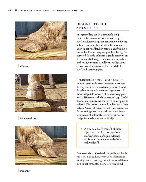 Dit boek legt je precies uit wat hoefkatrolontsteking is. Het ontstaan en de ontwikkeling van de aandoening, de diagnostische technieken en de beschikbare behandelmethoden worden allemaal uitgebreid besproken. Er is veel aandacht voor het cruciale belang van goede voeding, huisvesting, beweging, training en hoefverzorging. Na het lezen van dit boek weet je hoe je je paard met hoefkatrolontsteking zo goed mogelijk kunt laten behandelen en welke ondersteunende rol jij daarin kunt spelen. Je weet wat je moet doen en laten om te voorkomen dat de situatie verslechtert. Heeft je paard nog geen hoefkatrolontsteking maar wel andere oorzaken van pijn achterin de hoef, dan heb je met dit boek het gereedschap in handen om bijtijds het tij te keren.